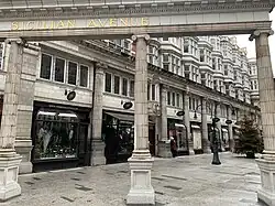 The avenue’s most distinctive feature are its two colonnades of Ionic order columns, one at either end of the avenue, each supporting an entablature with a balustrade supporting two ornate urns. The northwesternmost of these, at the avenue’s Bloomsbury Way entrance, comprises two columns with the end of each entablature terminating in and supported by the corner facades of 17 and 43 Sicilian Avenue. The colonnade at the avenue’s southeastern entrance on Southampton Row is free-standing, this time comprising four Ionic columns, again supporting an entablature and balustrade. The frieze of each colonnade is emblazoned with the name of the avenue in gold serif capitals.