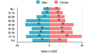 According to the 2002 Poland census, there were 400 people residing in Sielec village, of whom 47.5% were male and 52.5% were female. In the village, the population was spread out, with 25% under the age of 18, 34% from 18 to 44, 23% from 45 to 64, and 18% who were 65 years of age or older.[1]