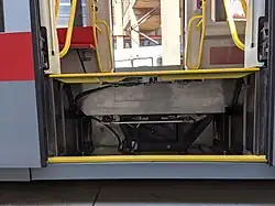 GCRTA's S200 vehicles will include steps at the front and back doors for boarding and alighting at street-level light rail stations and stops. These doors will also have manually operated trapdoors for use on the Red Line, which exclusively uses high-level platforms.[21] The introduction of S200 LRVs for the Red Line will require modifications at Red Line stations, as the S200 cars are narrower than the existing Tokyu trains.[22]