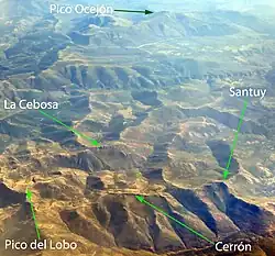 • To the south are the lower elevations, distributed anarchically, such as Cerro San Cristóbal, Pico de la Tornera, Pico de la Centenera, Cabezas and Palancar.
