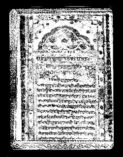 The Naina Devi temple near Paonta was a recipient of a copper plate by the Sikh guru.[2]: 302 [5] The presentation of this inscribed copper plate to the Naina Devi temple is recorded in a late 18th-century Sikh text called Sudharam Marag Granth ('Book of the Good Religious Path').[3]: 240–242 [5] This source asserts that Guru Gobind Singh gifted the copper plate to a Brahmin of Naina Devi named Bhadia while the guru visited the temple.[5] Bhadia was the head priest of a Havan ceremony being performed and had been paid 100,000 rupees by the Sikh guru.[5] However, Bhadia rejected this monetary sum and requested that the guru gift him something that will last for a long-time and survive throughout the generations to be revered.[5] As a result, the Sikh guru bestowed an inscribed copper plate, with its inscription in the form of a Hukam edict, to the Brahmin of Naina Devi instead.[5] The inscription etched on this copper plate was scribed in the Anandpuri Lipi style of Gurmukhi.[3]: 240–242 [5] This style of Gurmukhi script can also be found in Hukamnama manuscripts and Khas Patra pages of historical manuscripts of the Dasam Granth, which had been handwritten by the Sikh guru himself.[2]: 182 [5] Contemporary Sikh sources make no mention of the issuing of an inscribed copper plate to the Naina Devi temple by the Sikh guru.[3]: 240–242