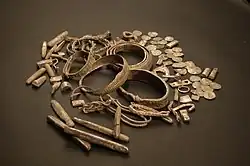 In September 2011, a metal detectorist unearthed the Silverdale Hoard, an early-10th-century Viking hoard comprising 201 silver coins, jewellery, ingots and hacksilver that had been buried in a lead container in the vicinity of Silverdale.[53] The hoard was bought by Lancashire Museums Service, and was displayed in Lancaster City Museum during 2013 and the Museum of Lancashire, Preston, during 2014.[54]