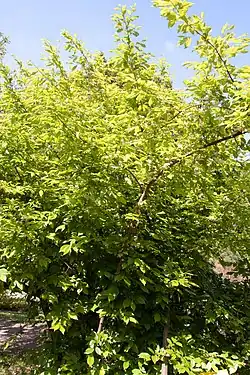 It is a deciduous shrub or small tree growing to 7 m tall, with a trunk up to 10 cm diameter. The leaves are alternate, simple, with a serrated margin and a 5 mm petiole; they are mostly 3–9 cm long and 2–5 cm broad and obovate to elliptic, but the leaves subtending inflorescences are smaller, 2–5 cm long and 1–2 cm broad. The inflorescences are 3–5 cm long, bearing three to five flowers with five petals.[2]