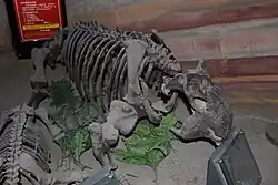 The front of the jaw had a small horn-covered beak, and there were two small tusks growing from bulbous projections on the upper jaw. These tusks could have been used to dig up roots.[3] Compared to Kannemeyeria, it had broader snout, smaller temporal fenestrae and lower temporal crests. Sinokannemeyeria may had rather indiscriminately seized and torn vegetation in contrast to the more selective cropping of Kannemeyeria.[4]