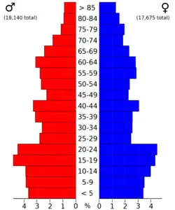 In the county, the population was spread out, with 27.10% under the age of 18, 15.20% from 18 to 24, 23.50% from 25 to 44, 19.10% from 45 to 64, and 15.00% who were 65 years of age or older. The median age was 33 years. For every 100 females there were 96.30 males. For every 100 females age 18 and over, there were 93.50 males.