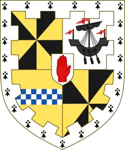 Quarterly 1st and 4th, Gyronny of eight or and sable 2nd, argent a lymphad sails furled and oars in action sable 3rd, Or a fess chequy azure and argent all within a bordure embattled ermine.