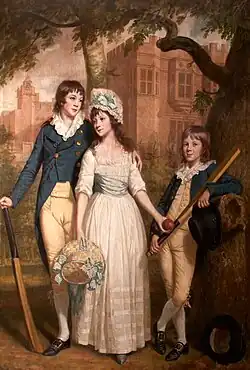 1793 Portrait by Thomas Beach with Old Shute House as background of the three children of Sir John William de la Pole, 6th Baronet (1757–1799): (l to r): William (1782–1847), future 7th Bt., Mary-Anne (b.1783) and John George (1786–1803). Collection at Antony House, Cornwall