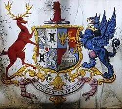 1808 commemorative stained glass window in Shute Church, Devon, south window of south transept, showing arms of Sir William Templer-Pole, 7th Baronet (1782–1847), son of 6th Baronet, impaling the arms of Templer, the family of his first cousin and first wife Sophia-Anne Templer (1788–1808), following whose death the window was made. Arms: Baron: quarterly 1st and 4th, Pole; 2nd & 3rd: Ermine, a millrind sable (Mills), over all an inescutcheon the Red Hand of Ulster; impaling femme: quarterly azure and gules, on a mount in base vert the perspective of an antique temple argent of three stories, each embattled; from the second battlement two steeples, and from the top, one, each ending in a cross sable on the pinnacle; in the first quarter an eagle displayed; in the second a stag trippant regardant or (Templer, granted 1765). The canting motto of Pole is shown below: Pollet Virtus, from the Latin verb Polleo, to be strong, mighty,[16] thus: "Virtue is powerful",[17] but which may also be read as Poll et Virtus, "Pole and Virtue"