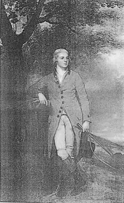 Sir John de la Pole, 6th Baronet (1757–1799), in uniform of Deputy Lieutenant of Devon,[1] in the library of New Shute House, Devon, built by him between 1787 and 1789, holding a plan of his new house in his right hand, from close study of which Maureen Turner (1999) was the first to discover the name of the architect Thomas Parlby, Esquire (1727–1802), his wife's uncle, the business partner and brother-in-law of James Templer, Senior, Sir John's father-in-law.[2][3] The Doric portico is visible through the window. Portrait by Thomas Beach (1738–1806), collection of Sir Richard Carew-Pole, Antony House, Cornwall
