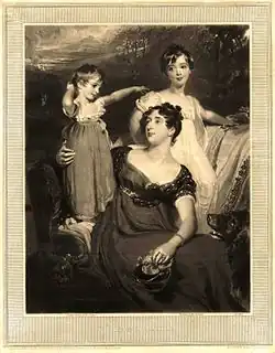 Thomas Dyke Acland (right) with his mother Lydia Elizabeth Hoare (centre) and Arthur Henry Dyke Acland (left). Mezzotint by Samuel Cousins, 1826.