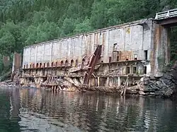 Sulitjelma Mines copper ore silo and transshipment facility. Boats docked at the pier (now gone) and trains arrived over the buildings. The trains emptied into the silos or directly into barges via the chute (middle). Each silo formerly had its own chute.