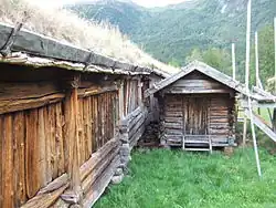 The elevated granary (stabbur) is one of the oldest parts of the farm's set of buildings.