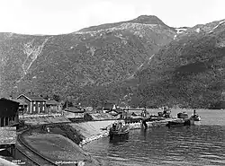 The harbor at Sjønstå with train station and dock. In 1956, the Sulitjelma Line was extended to Finneid and boat traffic was discontinued. After this Sjønstå became a remote and deserted place. Most buildings from this era have been razed.