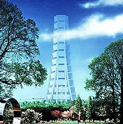 The proposal consisted of a building 1,000 m (3,281 ft) tall and 400 m (1,312 ft) wide at the base, with a total floor area of 8 km2 (3.1 sq mi).[3] The design, proposed in 1989 by the Takenaka Corporation, would have housed between 35,000[3][4] and 36,000[5] full-time residents as well as 100,000 workers. It consisted of 14 dish-shaped "Space Plateaus" stacked one upon the other. The interior of the plateaus would have contained green space, and the edges of the building would have contained apartments. The building would also have housed offices, commercial facilities, schools, theatres, and other modern amenities.[3]