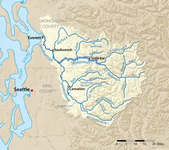 ![]() Map of the Skykomish River highlighted in the Snohomish River watershed | |