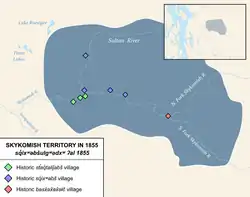 The traditional territory of the Skykomish people consists of the drainage area of the Skykomish River, upriver from the area between Monroe and Sultan.[1][6] The core area of Skykomish territory was from Sultan to Index.[2][10] At the time of contact, the Skykomish held roughly 538,040 acres of land along the Skykomish River.[5]
