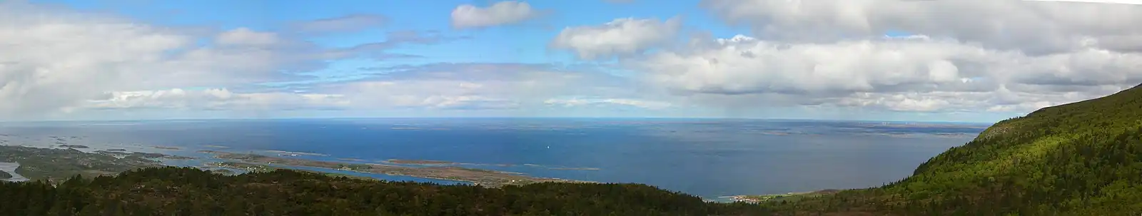 View of Smøla from Tustna in the distance to the right – you can see the Smøla Wind Farm if you enlarge the picture.