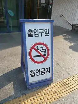 Since 1 January 2015, South Korea has completely banned smoking on all bars, restaurants and cafes regardless of size, including any smoking rooms. Any spotted smoker must pay fines of 100,000 won and up to 5 million won on shop owners not obeying the law.[29] Anyone can report a smoker via calling or sending a text message to a government hotline (in the case of Seoul, the number is 120) with their location address and authorities will raid the reported place, of which a picture of the offending smoker will be taken and fined 100,000 won. Disguised authorities also secretly check random places at random times for offending smokers. Furthermore, tobacco prices have nearly doubled to an average of ₩4,500 KRW, and it is illegal to advertise misleading claims such as "light", "mild", "low tar" or "pure" on cigarette packs.[30][31]