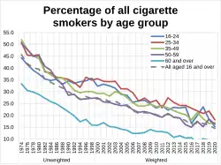In 2015, it was reported smoking rates in England had fallen to 16.9%, a record low.[20] In 2018, the UK smoking rate had fallen to 14.4%.[21] 25–34 year olds had the highest smoking rate, with approximately 1 in 5 people within this age range (around 1.4 million adults) being smokers.