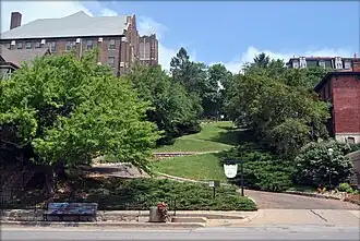 The Snake Alley Historic District is a nationally recognized historic district located in Burlington, Iowa, United States. It was listed on the National Register of Historic Places in 1975, and it was included in the Heritage Hill Historic District that surrounds it, in 1982. The historic district is largely a residential area that includes ten contributing properties.[2] It is centered on Snake Alley, a 275-foot (84 m) brick roadway built in 1894 that rises 58.3 feet (18 m) from Washington Street to Columbia Street.[2] The alley receives its name from the five half curves and two quarter curves that climb the hill. Cobblestone Alley is the eastern boundary of the district. It is a very steep roadway composed of large, limestone blocks. Six houses, built between 1845 and about 1880, surround Snake Alley. Schwartz' Auto Electric Service building and the First United Church of Christ complex round out the contributing buildings.