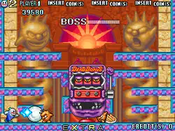 A new addition are three new playable characters, each with their own method of dispatching enemies from the playfield, however the snowman Tom was omitted in the sequel.[5] Another gameplay objective is to complete the words "EXTRA" at the bottom center by grabbing orbs left by defeated enemies that changes between letters and completing "EXTRA" gives the player an extra life, in addition of immediately advancing to the next stage. As with the first entry, the game hosts a number of hidden bonus secrets to be found, which are crucial for reaching high-scores to obtain extra lives. If a single player is downed, their character is immediately respawned. Getting hit by enemy fire or colliding against solid stage obstacles will result in losing a life, as well as a penalty of decreasing the characters' firepower and speed to his original state and once all lives are lost, the game is over unless the players insert more credits into the arcade machine to continue playing.