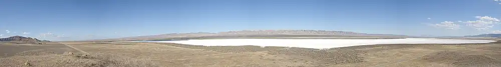 Soda Lake is a shallow, ephemeral, alkaline endorheic lake in the Carrizo Plain in southeastern San Luis Obispo County, California. The lake is located on the southwest side of the northern Carrizo Plain, 103 km (64 mi) east of San Luis Obispo. It can be reached by Soda Lake Road, which runs northwest–southeast between State Route 166 and State Route 58. The lake is at an elevation of 580 m (1,900 ft) and covers an area of about 12 km2 (4.6 sq mi).