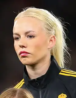 She was always used in the nine games played in qualification for the 2023 World Cup and scored one goal. After Russia were excluded because of the political attack on Ukraine, which violated international law, Denmark were confirmed as World Cup participants early. They last took part in a World Cup in 2007.[16] On 16 June 2022, she was nominated for the Euro 2022.[17] There she was used in two games as Denmark were eliminated in the group stage. On 30 June she was nominated for the World Cup in Australia and New Zealand.[18] She was not used at the World Cup, where Denmark made it to the round of 16 before being eliminated by Australia.