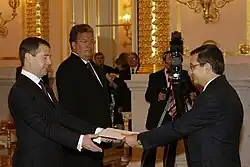 1. ^ "The ambassadors of ten countries presented their letters of credence to Dmitry Medvedev". The Kremlin, Moscow: Presidential Press and Information Office. 12 October 2009. Archived from the original on 28 March 2020. Retrieved 28 February 2010.