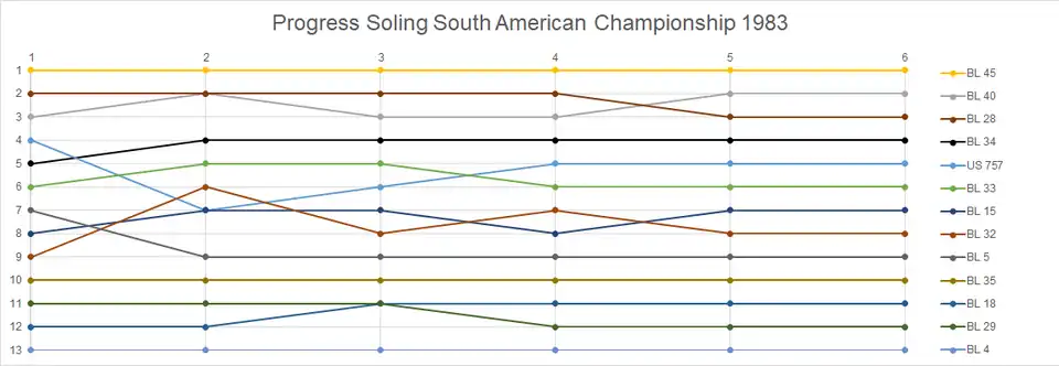 This article stated the results of the South American Soling Championships from 1971 till 1979. Not all crew names are documented in the major sources: United States Soling Association (USSA) bulletin "Leading Edge" and International Soling Association (ISA) magazine "Soling Sailing".