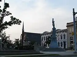 ![]() The Soldier's Monument in Somerset, Pennsylvania, pictured in the foreground with Somerset Anglican Fellowship (formerly St. Paul's Presbyterian Church) in the background. | |