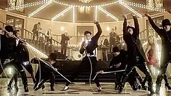 A teaser trailer was released on December 26, 2013, the day of TVXQ's tenth anniversary.[6] The sixteen-second teaser showed various snippets from the actual music video, which ended with words that read "10th Anniversary – Something". The full music video premiered on TVXQ's official video-sharing channels on January 1, 2014, at 6pm KST.[23] The video, filmed sometime in early December 2013 in Paju, took three days to shoot. It features a big band ensemble with TVXQ dancing in two different studio settings – a brightly lit opera house set and an alleyway. The outfits worn in the video include flowery and pinstriped cutaway tailcoats, wide-legged trousers, and other roaring twenties-driven pieces, some which were by Ann Demeulemeester from the spring 2014 collection.[24] The duo closely worked with choreographer Tony Testa and performance director Hwang Sang-hoon for the song's dance choreography.[25] Inspired by the project's period setting, they added microphones in their choreography and used them as ropes. The dance has three main points (highlights): the bass guitar strumming, the boxing ring, and the marionette dance.[26] The duo had described the dance as "extremely difficult; defying the laws of gravity".[5] The highly interactive dance choreography features both male and female dancers. Drawing inspirations from swing, Charleston and modern jazz dance, it also features many inversions and sliding movements.