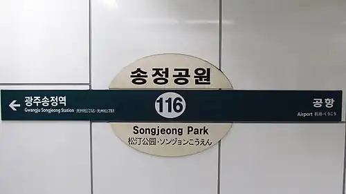 Songjeong Park station (Korean송정공원역; Hanja松汀公園驛) is a station of Gwangju Metro Line 1 in Songjeong-dong, Gwangsan District, Gwangju, South Korea. It serves as a transit station using local buses for citizens living in residential areas such as Hanam, Unnam, and Suwan. There is a subway literature museum at this station.