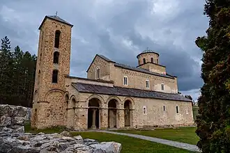The Sopoćani Monastery (Serbian: Манастир Сопоћани / Manastir Sopoćani, pronounced [sǒpotɕani]), an endowment of King Stefan Uroš I of Serbia, was built from 1259 to 1270, near the source of the Raška River in the region of Ras, the centre of the Serbian medieval state. It is a designated World Heritage Site, added in 1979 with Stari Ras. The monastery is located 15 kilometers (9.3 mi) west of the town of Novi Pazar.