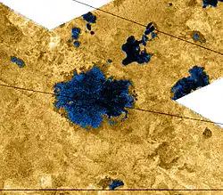 ![]() False-color Cassini synthetic aperture radar image of hydrocarbon lakes on Titan. Bolsena Lacus is at center, with Sotonera Lacus to its upper right. | |