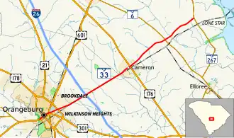 South Carolina Highway 33 (SC 33) is a 19.360-mile-long (31.157 km) state highway in the U.S. state of South Carolina. The highway connects Orangeburg with the Lone Star area, via Cameron.