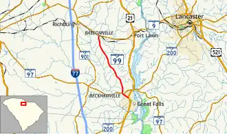 SC 99 begins at an intersection with U.S. Route 21 (US 21) and SC 200 (Pendergrass Boulevard) in Great Falls within Chester County. It travels to the northwest. On the edge of the city limits of the town is an intersection with SC 97 (Francis Avenue). They have a very brief concurrency. SC 99 travels in a north-northwesterly direction and passes Howze Cemetery. The highway continues traveling through rural areas and meets its northern terminus, an intersection with SC 9 (Lancaster Highway).[2]