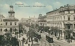 In 1881, there was opened the second horsecar line in the city, connecting the Union of Lublin Square with Muranów.[70][71] In 1908, it was replaced with an electric tram line.[72] In 1892, next to the square, between Puławska and Chocimska Streets, was opened the Warsaw narrow-gauge railway station (later renamed to Warsaw Mokotów in 1930). It was part of two lines operated by the Wilanów Railway. In 1898, there was also added line of the Grójec Commuter Railway.[73][74] The station was moved in 1935 further south, to the intersection of Puławska and Odyńca Streets, where it operated until 1938.[75]
