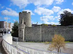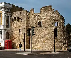 Little remains of the eastern walls, but in the north-east corner several towers still remain largely intact, including Polymond tower, a powerful drum tower largely reconstructed during the Victorian period.[70] Further west is the Bargate; this was originally a simple archway but was expanded with drum towers and arrow slits in the early 14th century, and then expanded again in the early 15th century with battlements and parapets, before being heavily restored in the 19th century.[71] The Bargate remains an elaborate building, taking military symbolism and combining it with rich civic heraldry and decoration above the gateway.[72]
