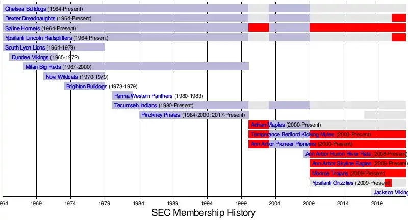 The SEC was formed by three schools from the disbanding Washtenaw County League (Chelsea, Dexter, and Saline), two from the Huron League (Dundee and Ypsilanti Lincoln), and independent South Lyon. The league expanded to eight by 1969, with Novi joining from the Lakeland Conference that year, and Milan joining from the Huron in 1967. In 1973 Dundee left for the Michigan-Ohio Border Conference, and was replaced by Brighton, joining from the Wayne-Oakland League. 1979 also brought major change to the conference, as Brighton, Novi, and South Lyon left for the Kensington Valley Conference. Parma Western joined that year, having been independent since leaving the Cascades Conference in 1976. Tecumseh left the Huron League to join the Southeastern in 1980, bringing the conference to seven members. Western returned to the Cascades Conference in 1983, as their replacement, Pinckney, left the Kensington Valley Conference in 1984.