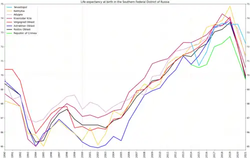- ^ "Ожидаемая продолжительность жизни при рождении" [Life expectancy at birth]. Unified Interdepartmental Information and Statistical System of Russia (in Russian). Retrieved June 1, 2022.