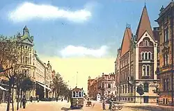 The building's architecture is striking, featuring a rectangular layout and distinctive Secessionist elements like floral motifs and geometric designs.[3] A triangular pediment crowns the main entrance, while a tower with a balcony marks the corner of the structure.