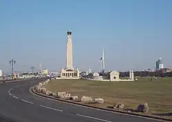 During the same period, Southsea grew as a leisure and bathing destination. In 1816 a pump room and baths were erected near the present day Clarence Pier, and by 1820 a large complex was developed including vapour baths, showers, and card playing and assembly rooms.[18] The remaining marshland, known locally as The Great Morass was drained, leading to the creation of Southsea Common, some 480 acres (about 2 km2) of open grassland. Due to military requirements for clear lines of fire adjacent to Southsea Castle, the area was developed and remains today as a park and garden.[19] Apartments and hotels were constructed towards the common and waterfront, along Southsea Terrace, Western Parade and Clarence Parade. The first large hotel was the Portland Hotel (destroyed in the Second World War) near Kent Road. Others soon followed, including the purpose-built Queens Hotel (1861), Pier Hotel (1865) and Beach Mansions Hotel (1866).[20] In 1852 the Clarence Esplanade and a memorial were erected by public subscription, and development of the resort led in 1861 to Clarence Pier being constructed as a promenade pier and landing place for steamers.[21] Other piers were also built, including the Victoria and Albert Piers, with the construction of South Parade Pier in 1879 marking the culmination of seafront development in the Victorian period.[22]