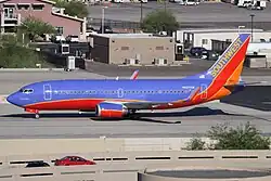 Boeing 737-300 in 2007 wearing the original Desert Gold livery that was used until January 15, 2001. This livery remains on a 737 MAX 8 in honor of founder Herb Kelleher.