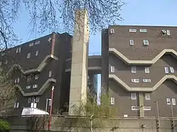 It was designed in 1968-70 by a team of architects including Magda Borowiecka, and built between 1972-1981.[5] The building was designed to account for the South Cross Route motorway passing adjacent to the building, and although the motorway plan was scrapped in 1973, the design was kept, including small windows on the wall that would have faced this flyover.[1] Borowiecka said "The motorway would have been 60ft up in the air, so I needed to create a blank wall going up higher than that. It was rather miserable and I had to think of some way to make an interesting building."[1]