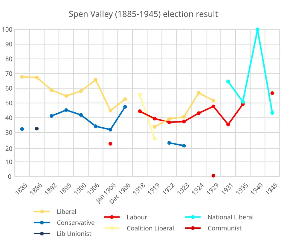 The death of the sitting MP in 1919 led to a sensational by-election gain for the Labour Party, which was described by historian Maurice Cowling as the worst result for the Coalition during the 1918–22 Parliament;[5] John Ramsden admitted that Labour's win had a big psychological impact on the Coalition but thought the result was a "freak win" given that Labour had under 40% of the vote.[6] At the ensuing general election, the Manchester Guardian described the constituency as "scattered between the three towns of Leeds, Bradford and Huddersfield", centred on Cleckheaton, and populated by "woollen and wire workers, miners, card manufacturers". A significant presence of Irish voters was also noted.[7] Sir John Simon, a former Home Secretary who had lost his seat in the 1918 election, regained the seat for the Liberals in 1922 and held it until given a Peerage in 1940. During this period Simon moved from declaring his basic sympathy with the Labour Party's objects, to forming the Liberal Nationals who went into alliance with the Conservatives.[8] Simon found his constituency marginal, and had a majority of under 1,000 in his last election, and Labour gained it in the 1945 election landslide.