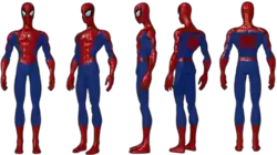 Peter Parker was originally supposed to wear baggier clothes to hide his superhero musculature, but cost-effective difficulties with the CGI prevented folds from being put into his everyday attire. As a result, Peter's street clothes were redesigned to be close-fitting and contemporary, while still managing to hide his physique (and the costume he wore under his clothes) as Spider-Man.[2] The character of Aunt May was not included in the series (except for a photograph in Peter's bedroom), because MTV executives feared that the appearance of any elderly people would deter their target youth audience from watching.[8]