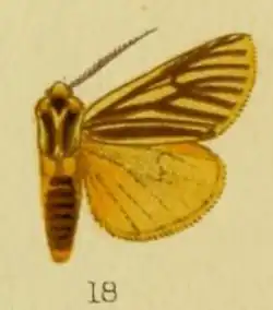 Head and thorax yellowish white; palpi, a patch on frons, tegulae, patagia, and dorsal stripe on thorax black; pectus and stripes on legs black; mid and hind femora orange above; abdomen orange with dorsal black bands, lateral stripes and ventral series of spots. Forewing yellowish white; the veins rather broadly striped with black especially the medial part of vein 1; narrow stripes in cell and submedian fold; cilia yellow. Hindwing orange vellow.