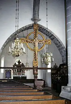A 15th-century wooden crucifix has been incorporated into the Baroque altarpiece which was made in the late 17th century in Burgsvik on Gotland.[32] The wooden pulpit bears the date 1723 and the monogram of Frederick I of Sweden.[33] The pews are probably from 1693.[34]