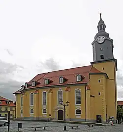 The St.-Jakobus-Kirche (pronounced [zaŋkt jaˈkoːbʊsˌkɪʁçə], "St James Church") in the historical centre of Ilmenau, Thuringia, Germany, is a Lutheran parish church. The Ilmenau parish belongs to the Arnstadt-Ilmenau district of the Protestant Church in Central Germany.[1] Colloquially, the St.-Jakobus-Kirche is called the Stadtkirche ("Town Church") for short. It houses the largest Romantic church organ in the state of Thuringia.