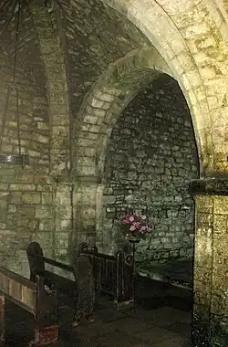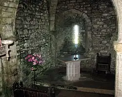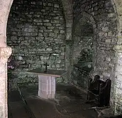 The interior of the chapel is approximately 7.7 metres (25 ft) square.[1] In the centre is a square pier supporting four square rib vaults, with the heavy ribs leading to transverse arches, all stop-chamfered.[4] In the north-west side is a Norman round-arched doorway. A small window is contemporary with the doorway. The corners of the chapel are orientated towards the cardinal points. The interior of the chapel contains a 12th-century groin vault, supported by a central column. Evidence uncovered during 20th century repairs to the chapel roof suggest that it may have been topped with a beacon at some time.[3] The roof now bears a stone cross erected in 1873.[5]